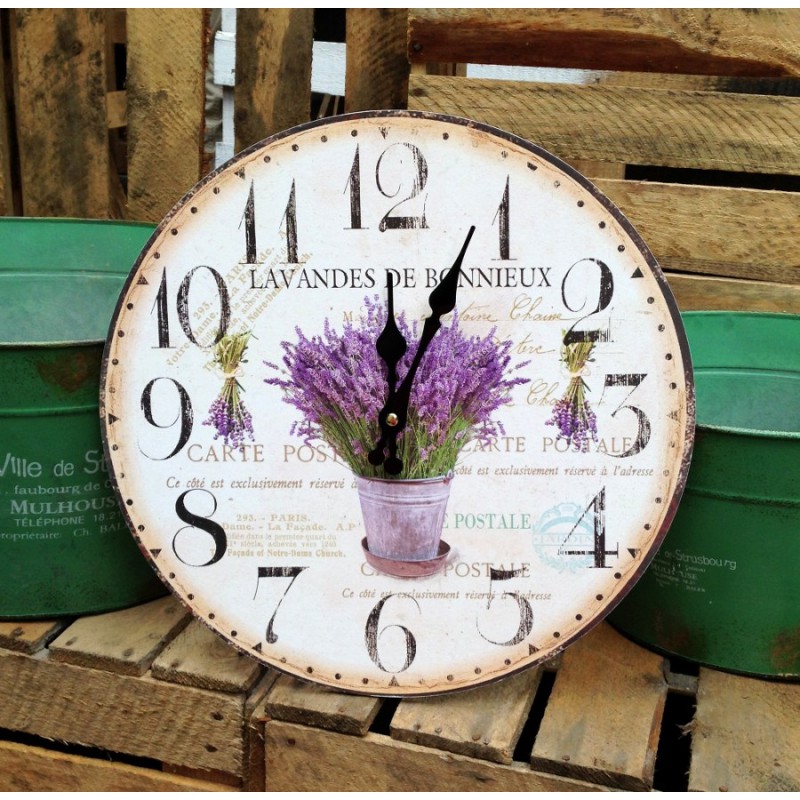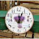 Prowansalskie zegary ścienne z pięknym motywem lawendy na tle francuskich napisów.