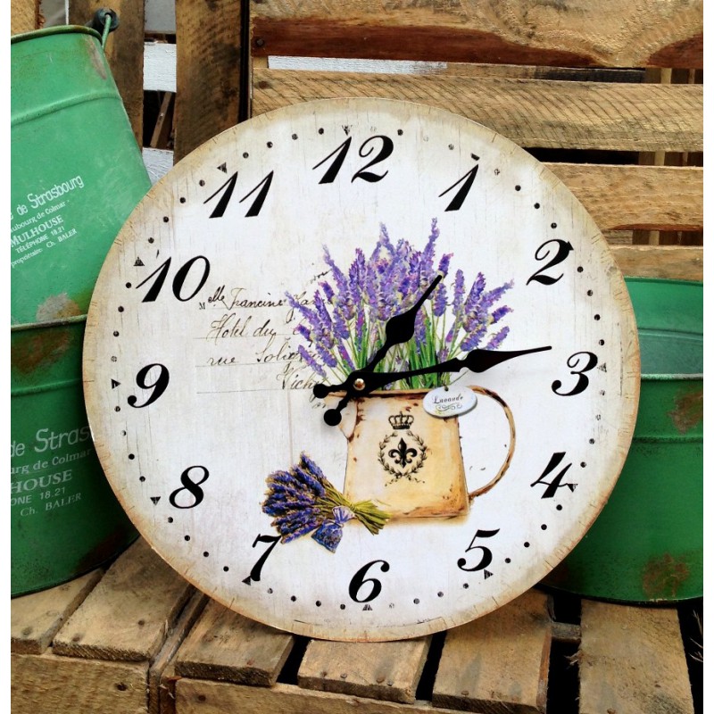 Ścienne zegary z lawendą w dzbanku obok którego leży bukiet lawendy oraz lawenda suszona w woreczku. Obok dzbanka z lawendą znajdują się francuskie napisy. Tarcza wykonana jest z MDFu, a wskazówki z metalu. Do zegara polecamy inne dodatki prowansalskie z motywem lawendy, czyli podkładki stołowe, wieszaki ścienne, obrazy i wiele innych.