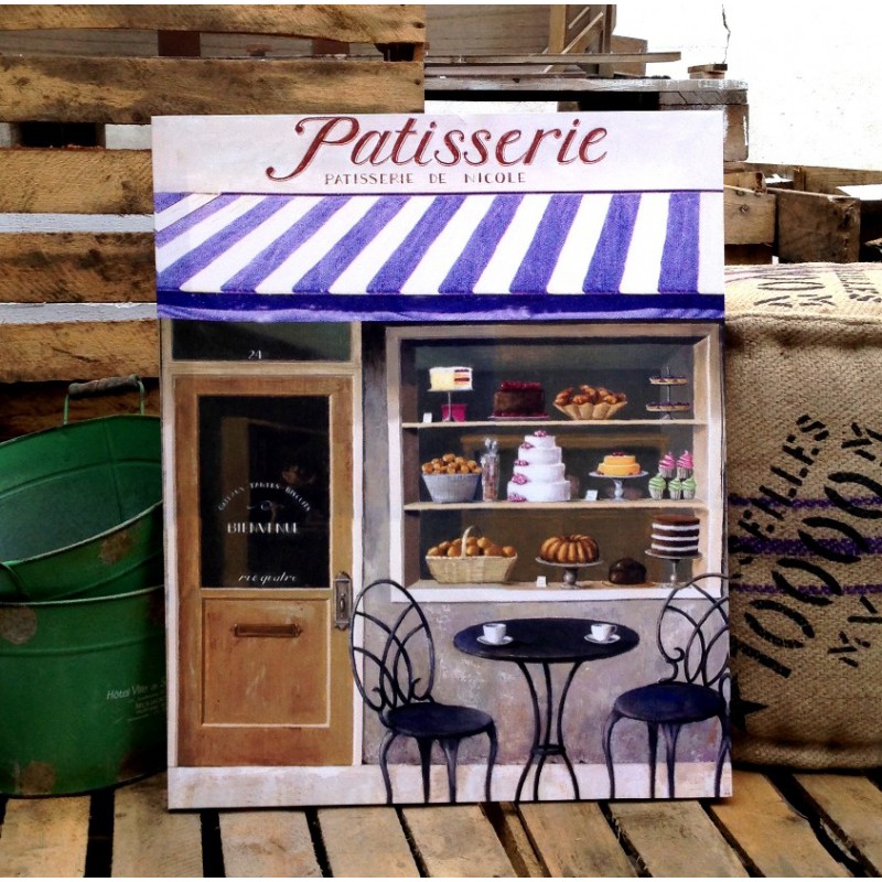 Śliczne obrazy francuskie zauroczą Państwa doskonałym doborem barw i prostotą przekazu. Spojrzenie na witrynę malutkiej francuskiej kawiarenki z rozsunięta markizą w biało-niebieskie paski, okrągłym stoliczkiem z dwoma krzesłami i bogatą wystawę najróżniejszych słodkości - styl francuski w pełnej krasie.
