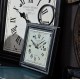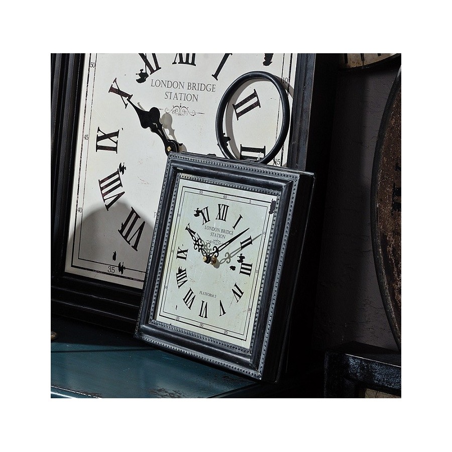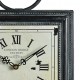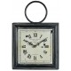 Stylizowane zegary kwadratowe marki Belldeco z postarzaną tarczą i dekoracyjnym, metalowym kołem.