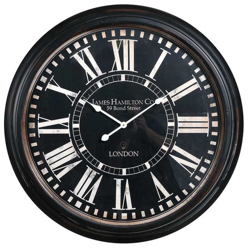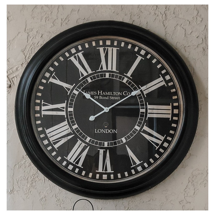 Retro Zegar James Hamilton to duży zegar Belldeco, którego czarna rama wykonana jest z metalu, a tarcza przeszklona. Na tarczy znajdują się napisy oraz przecierane, elegancko wyglądające cyfry rzymskie.