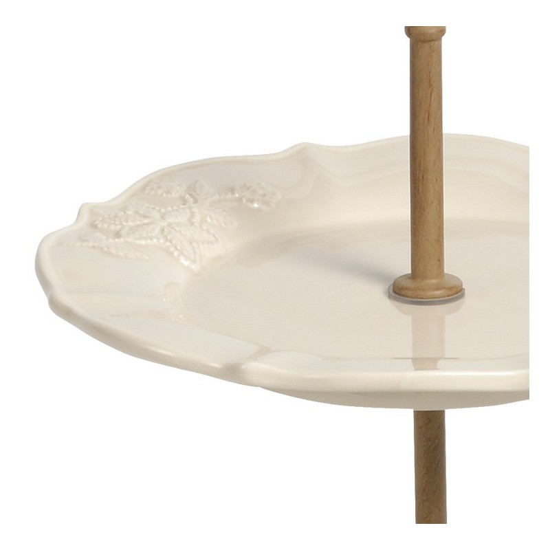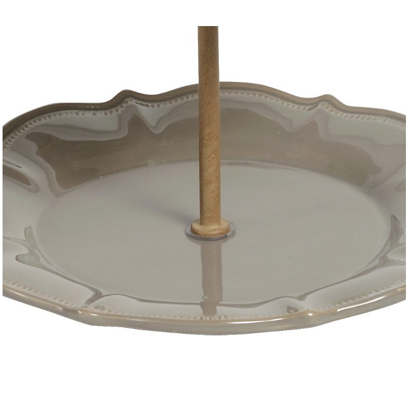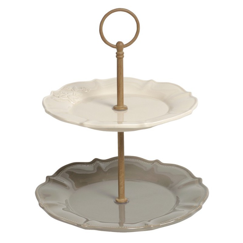 Etażerka Belldeco, której dolny talerz ma szary, a górny beżowy kolor. Powierzchnia talerzy jest ozdobiona wzorem wypukłego kwiatuszka. Do etażerki polecamy inne elamenty ceramiki Belldeco.