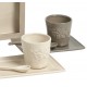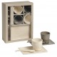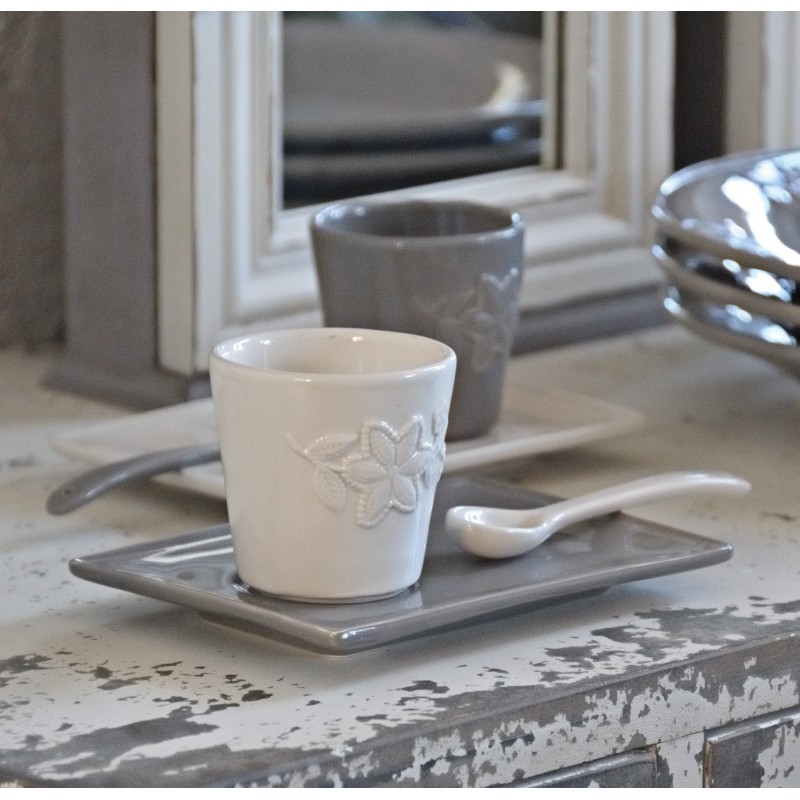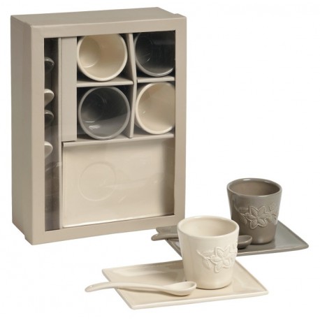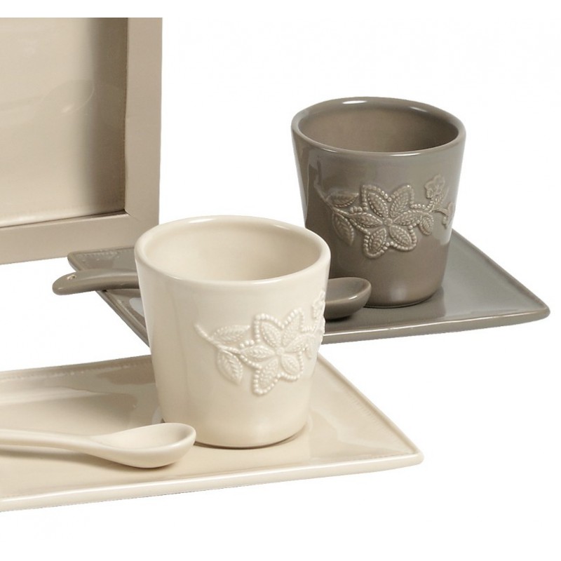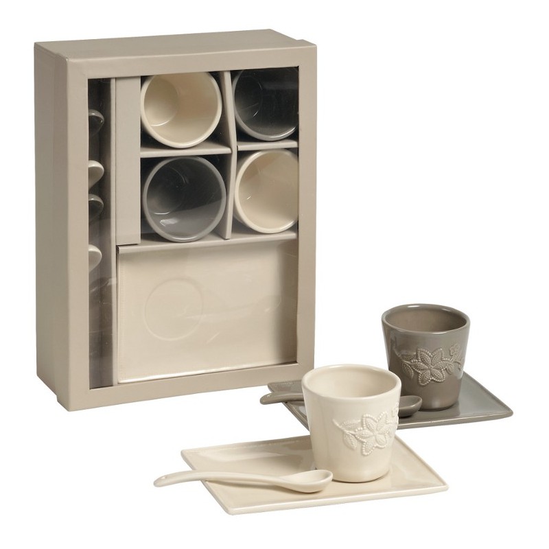 Cztery filiżanki do espresso lub małej kawy z serii Sorrento Belldeco. Filiżanki mają kształt kubeczków i są ozdobione wupukłymi kwiatuszkami. Sprzedawane są w zestawie zapakowanym w eleganckie pudełko. W jego skład wchodzą cztery filiżanki, cztery łyżeczki i cztery prostoktne talerzyki. Dwie filiżanki z łyżeczkami i podstawkami mają kremowy kolor, a dwie szary.