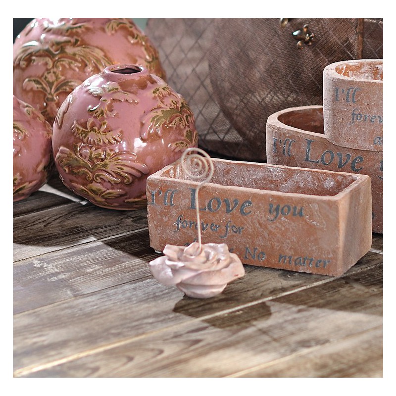 Różowy stojak na zdjęcie czy wizytówkę shabby chic z rdzawymi przetarciami oraz wyrytymi napisami. Stojak wygląda bardzo uroczo, z pewnością spodoba się każdemu miłośnikowi stylu shabby chic.