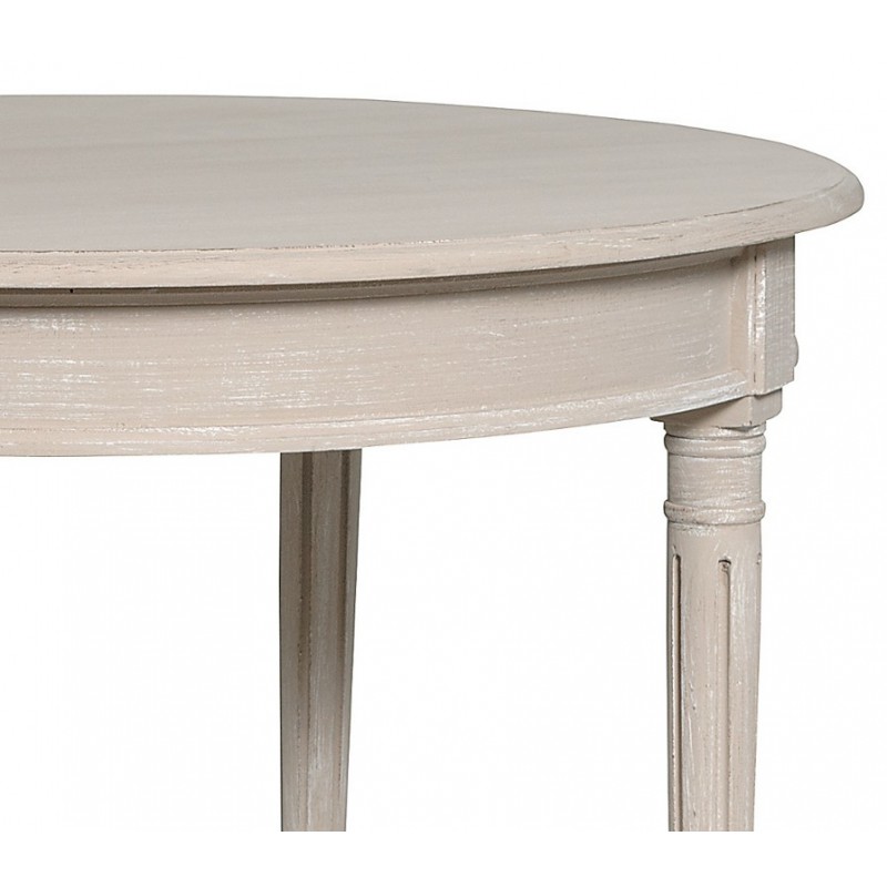 Bosco Stół Belldeco to okrągły stół prowansalski o szarym, przecieranym bielą kolorze. Na stole widoczne są także subtelne przetarcia farby do brązowego koloru. Stół Bosco posiada cztery elegancko i stylowo rzeźbione nogi, a jego powierzchnia jest surowa - nielakierowana i matowa.