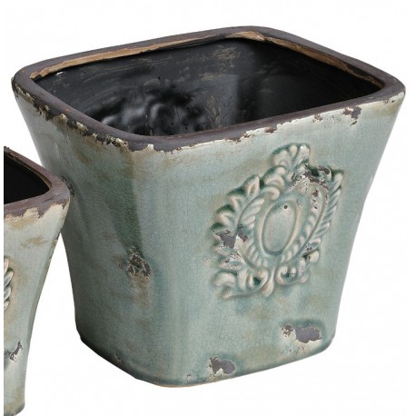 Stylizowane donice Belldeco o nietypowym, rozszerzającym się ku górze kształcie. Na doniczkach znajduje się wypukły ozdobnik, a cała powierzchnia donic jest pokryta spękaniami, beżowymi przetarciami oraz odpryskami farby, dzięki czemu donice wyglądają bardzo ciekawie i oryginalnie.