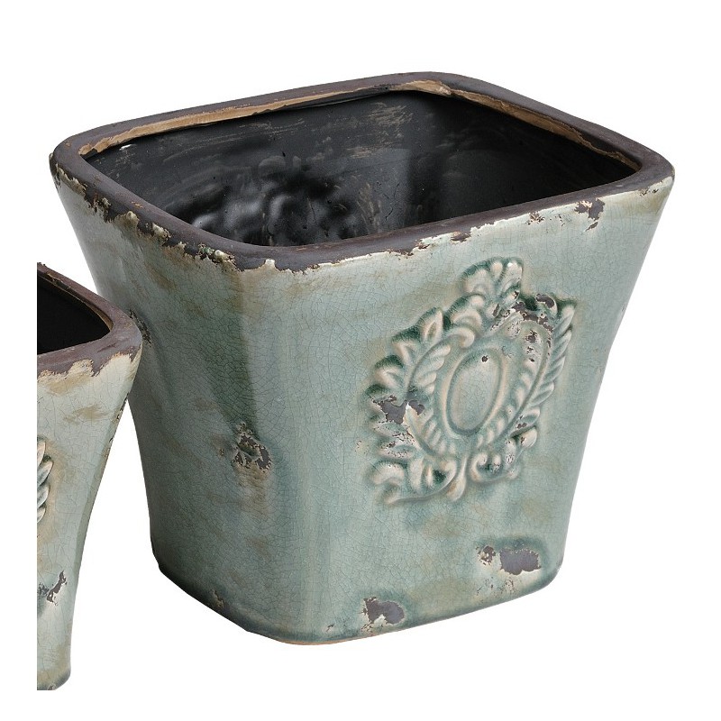 Piękne, stylizowane donice Belldeco o kwadratowym kształcie i efektownie postarzanej powierzchni.