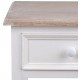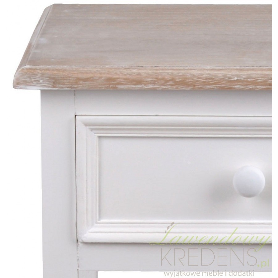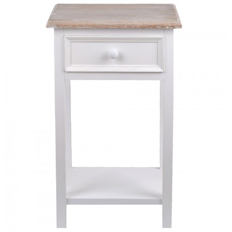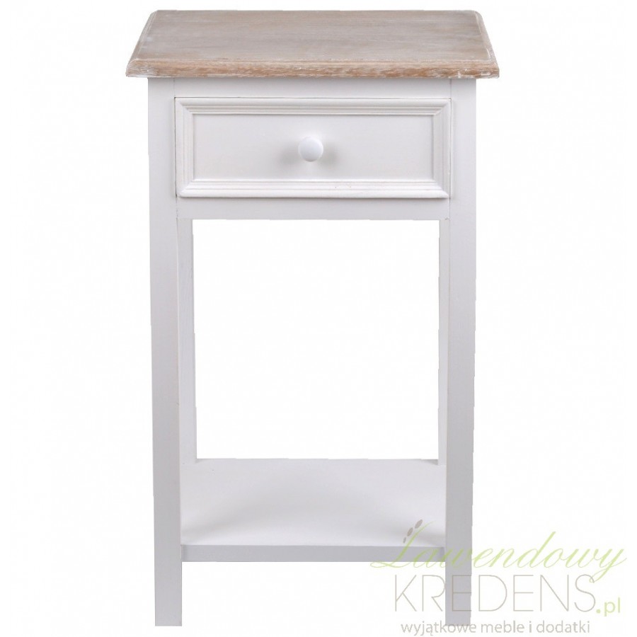 Bardzo efektowny, biały stolik nocny w rewelacyjnym zestawieniu kolorystycznym, łączącym w sobie klasyczną biel podstawy z brązem delikatnie bielonego blatu. Całość prezentuje się niezawodnie, a pojemna szufladka i dolna półka zawsze przydadzą się na ulubione przedmioty.