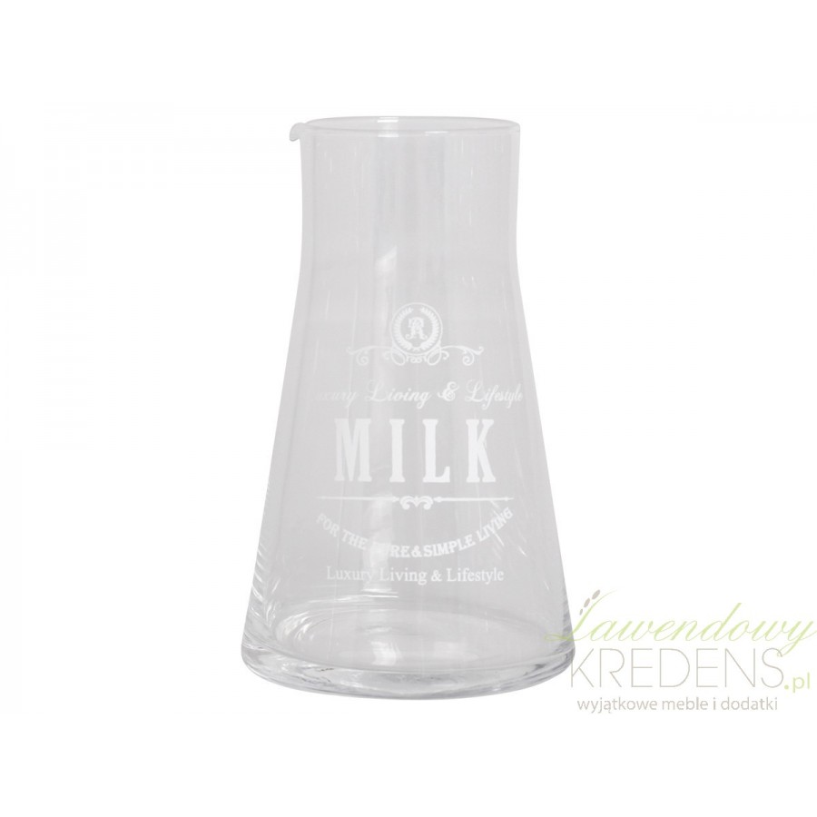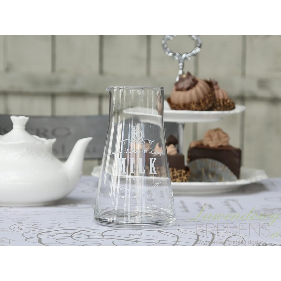 Dodatki do kuchni pełnią niezwykle istotną rolę w wystroju wnętrza. Dzbanek na mleko firmy Chic Antique wykonany jest z dobrej jakości przezroczystego szkła z białym ozdobnym napisem MILK. Ma podłużny kształt i delikatny dziubek, co sprawia, że jest uroczy i świetnie wygląda na stole.