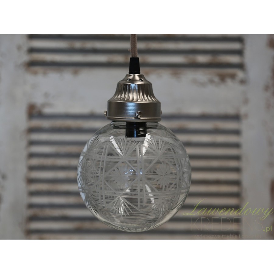 Sufitowa, szklana lampa z metalową nasadką i okrągłym kloszem w kstałcie śnieżnej kuli ze wzorkami! Polecamy!