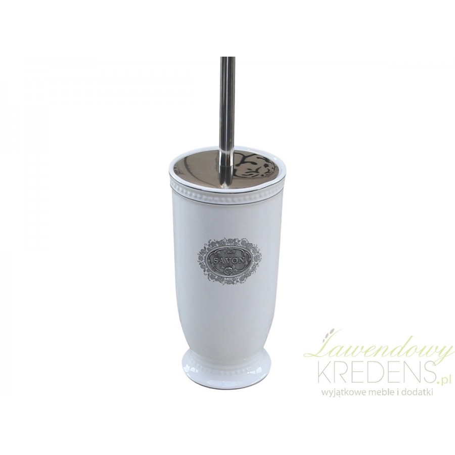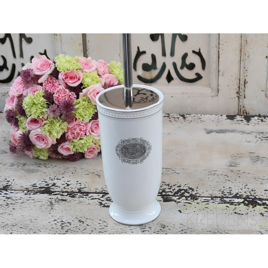 Ozodbna szczotka do wc w wysokim białym pojemniku z wypukłymi wzroami i tabliczką z napisem SAVON. Szczotka posiada metalową rączkę, która wraz z połyskującą pokrywką dopełniają prowansalską kompozycję i styl. Spraw, by Twoja łazienka była miłym miejscem relaksu!