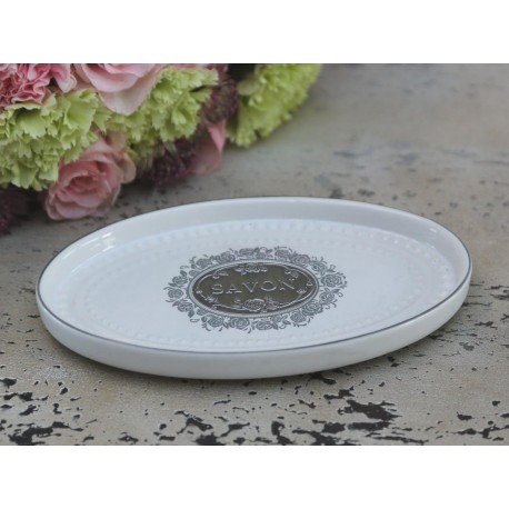 Specjalnie wykonana z wysokiej jakości ceramiki mydelniczka prowansalska z kolekcji Chic Antique z wysoką, praktyczną krawędzią, która zapobiegać będzie "uciekaniu" mydła. Specjalne, wypukłe wzorki na obwodzie oraz metalowa tabliczka z napisem SAVON dopełniają estetycznie całość! Poznaj wszystkie dodatki do łazienki z tej serii!