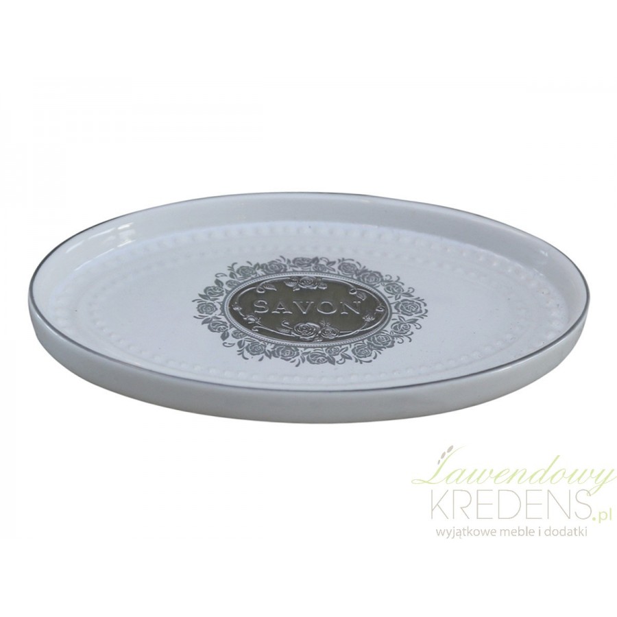 Piękna, owalna mydelniczka ceramiczna w stylu prowansalskim rewelacyjnie wyglądającą, metalowa tabliczką.
