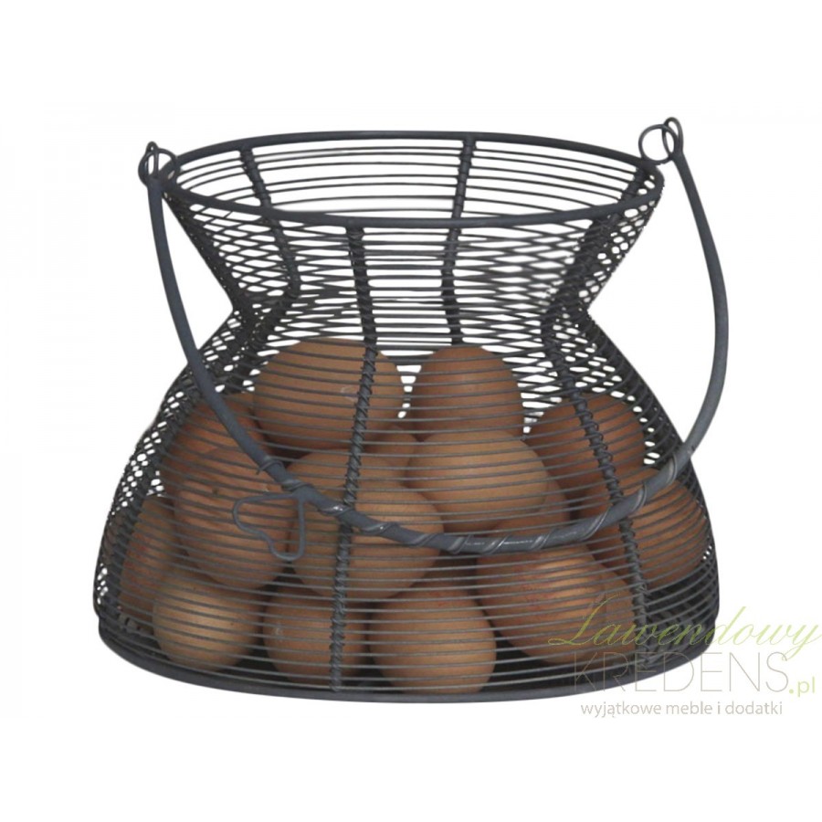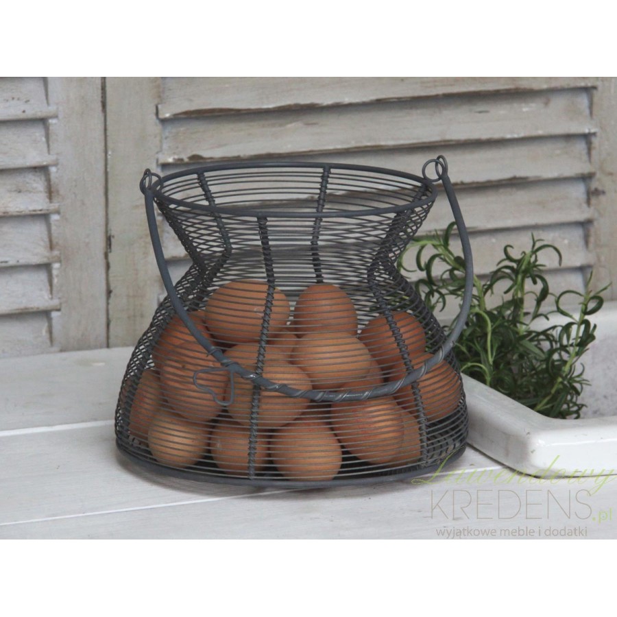 Metalowy koszyk w stylu prowansalskim o szarym kolorze powierzchni, którą stanowią poziome pręciki opierające sie na sześciu pioniowych wspornikach. Funkcjonalna forma koszyka umożliwia przechowywanie w nim produktów spożywczych, zwłaszcza warzyw i owoców, które potrzebują powietrza. Metalowe serduszko na uchwycie, sprawia, że te dodatki prowansalskie wyglądają naprawdę słodko!