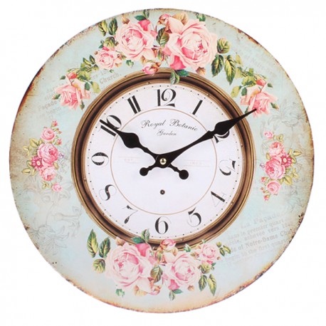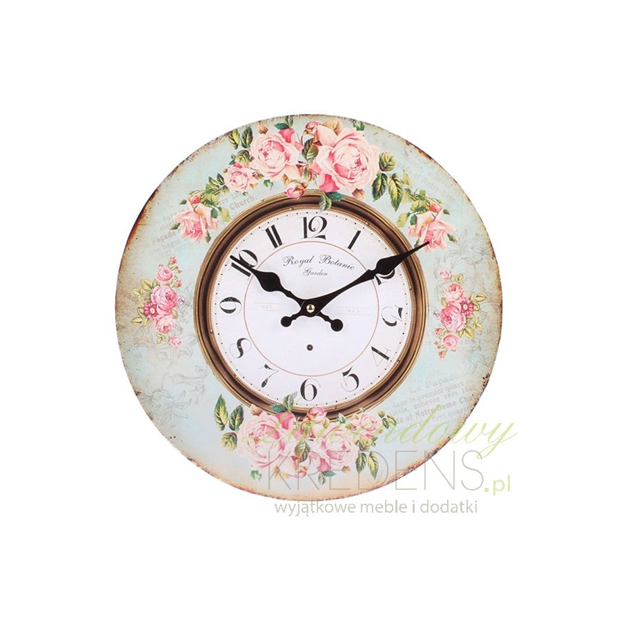 Zegar prowansalski o średnicy 34 centymetrów z białą tarczą i okalającą ją różaną ramą, delikatnie postarzaną przy zewnętrznych krawędziach. Delikatność i subtelność płynące od prezentowanego zegara promienieją na całe wnętrze, a stonowane, ale wyraziste kolory ożywiają ścianę na której zawiśnie!