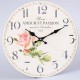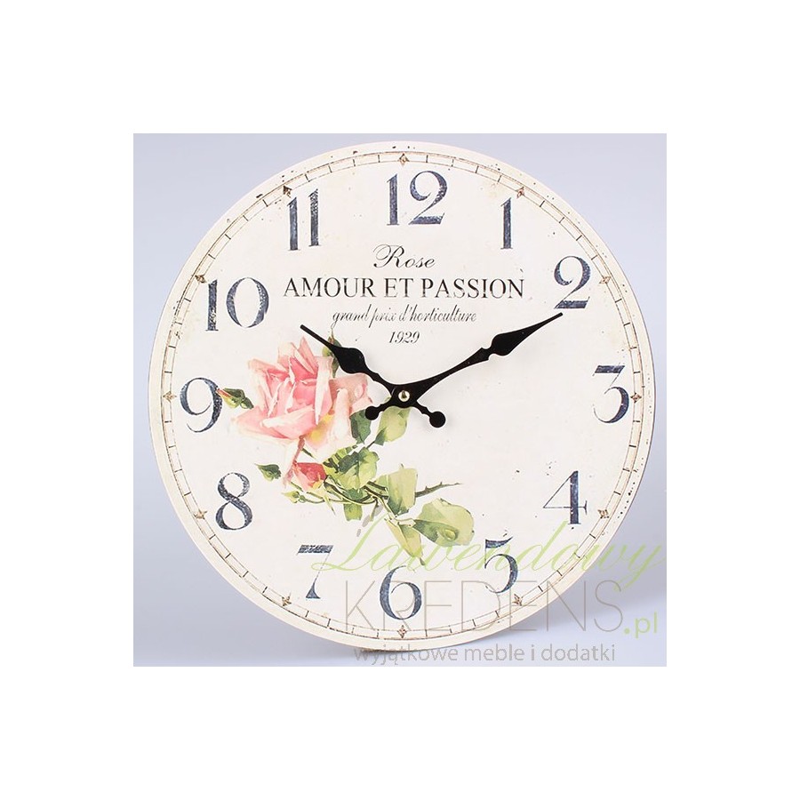 Czarowny zegar prowansalski, ścienny o okrągłej tarczy w kolorze beżowym z piękną grafiką różowej róży!