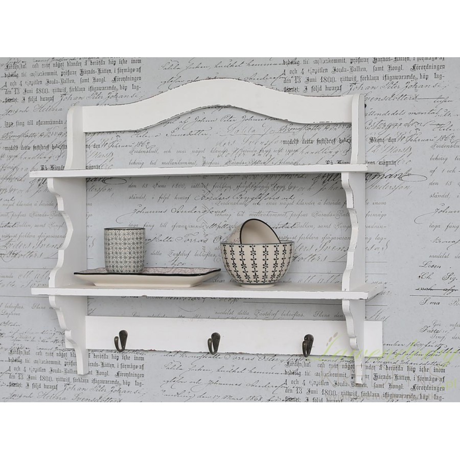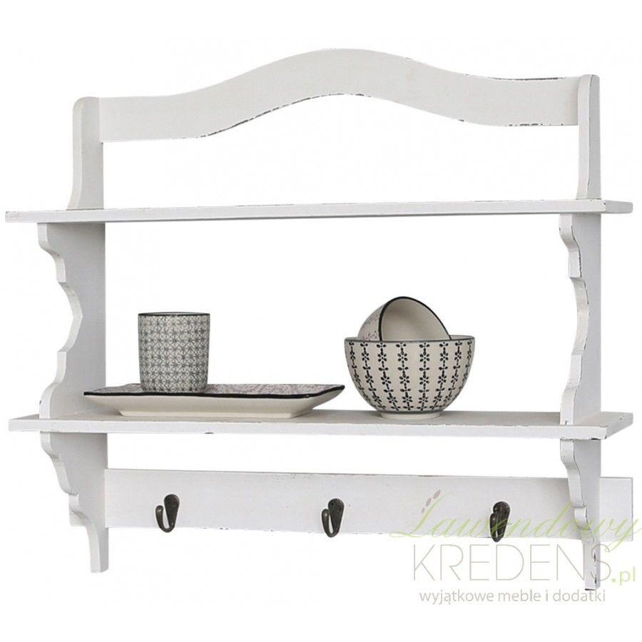 Nadające przestrzeni rodzinnego i swobodnego klimatu, meble w stylu prowansalskim to wyjątkowo funkcjonalne i piękne elementy wyposażenia wnętrz. Prezentowana półka wisząca z dwiema szerokimi półkami i praktycznymi wieszakami na ściereczki czy fartuszek, której biała powierzchnia jest delikatnie przetarta, zwłaszcza na krawędziach, dzięki czemu mebel ten wygląda bardziej domowo i przytulnie!