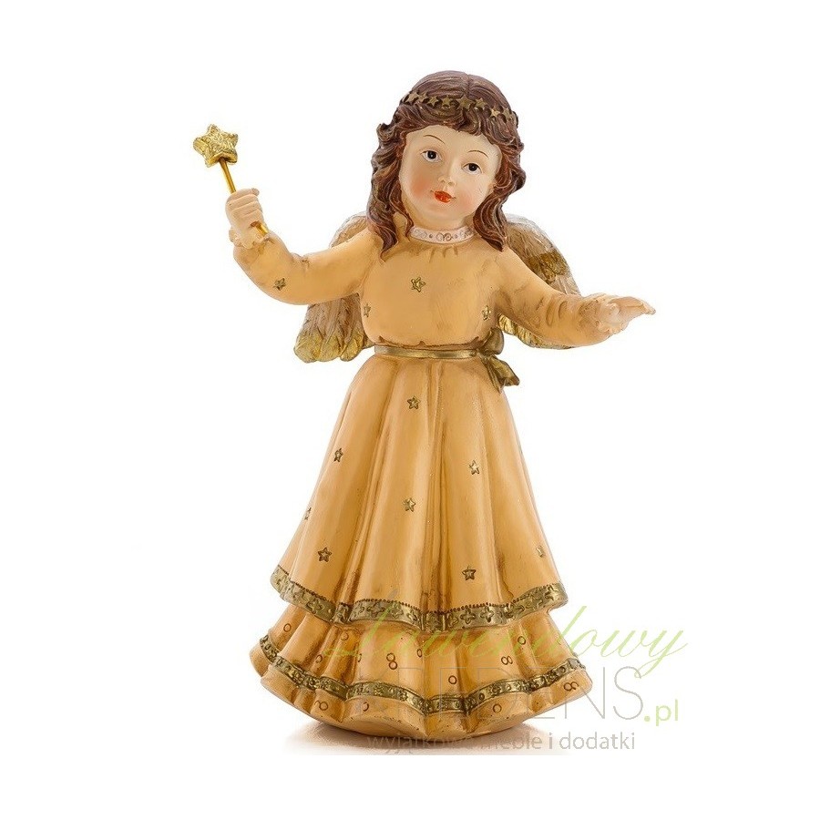 Piękna figurka aniołka jest subtelną a zarazem elegancką ozdobą, którą możesz umieścić np. na świątecznym stole. Aniołek posiada urocze, złote skrzydła oraz miodową suknię udekorowaną gwiazdkami. Całość prezentuje się nadzwyczaj korzystnie. Polecamy!