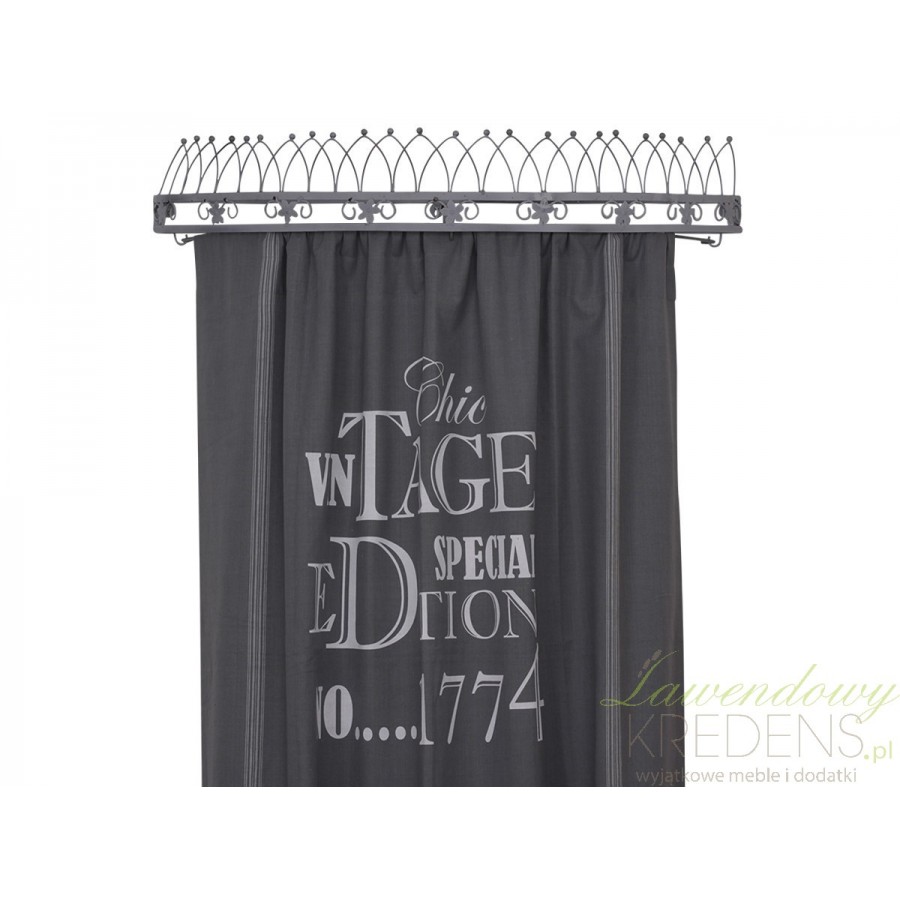 Długa, szara zasłona w stylu prowansalskim z jasnymi, nadrukowanymi napisami w języku angielskim. Polecamy!