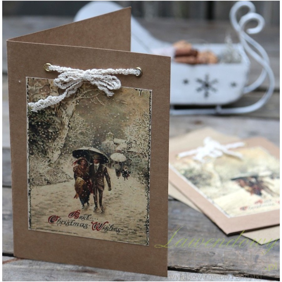 Nastrojowa kartka świąteczna z życzeniami na Boże Narodzenie, z zaśnieżoną leśną drogą, po której przy padającym intensywnie śniegu idzie elegancko ubrana para pod parasolem. Nad całoscią góruję przewiązana na kokardkę koronka, przełożona przez specjalne otwory. Zrób bliskim miłą niespodziankę i wyślij im kartki świąteczne!