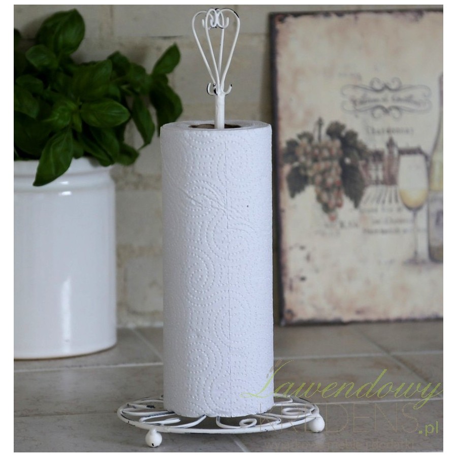 Metalowy stojak na papier kuchenny w kolorze antycznej bieli z dekoracyjna podstawką i górnym wykończeniem.