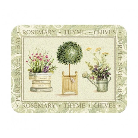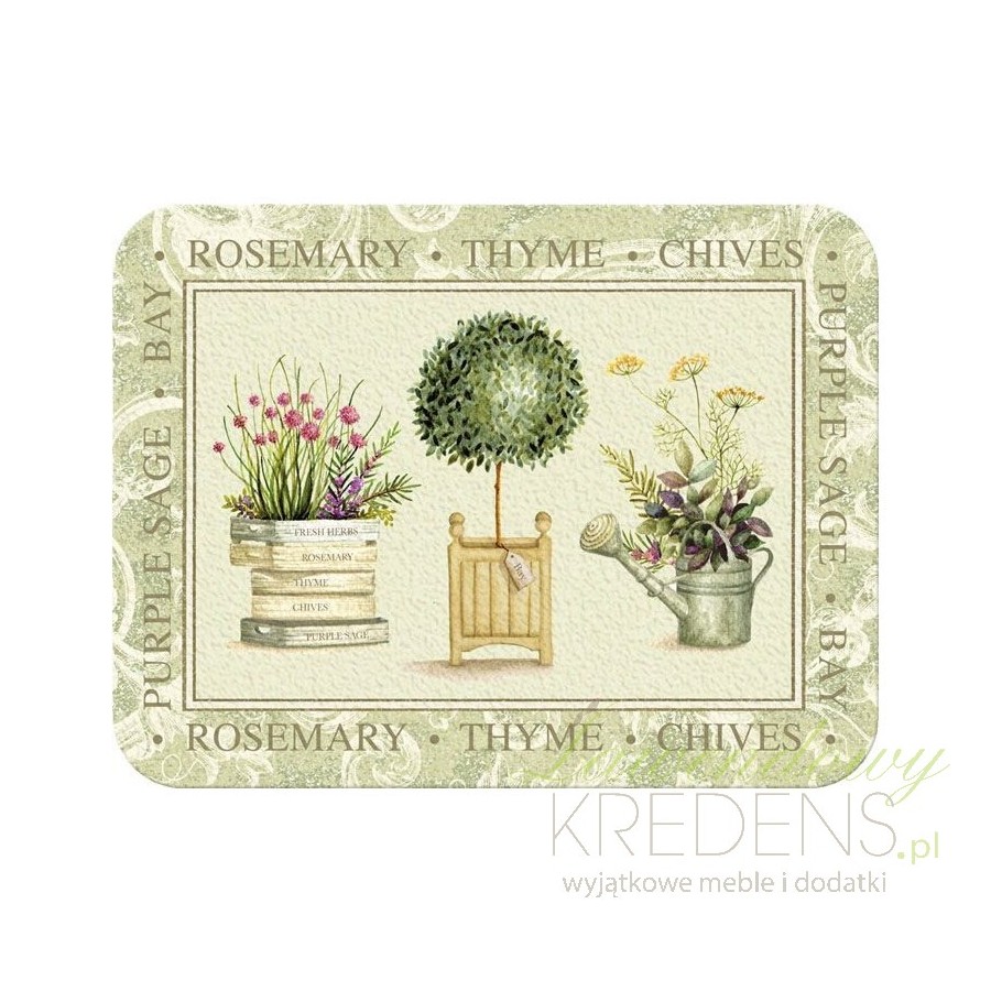 Dodatki do kuchni, a wśród nich podkładki stołowe firmy Creative Tops udekorują w piękny sposób twoją kuchnię i wniosą do niej mnóstwo pozytywnej energii. Podkładki korkowe mają kształt prostokąta a naokoło w zielonej ramce znajdują się nazwy roślin. W ramce znajduje się obrazek drzewka i dwóch roślin w kolorach różowym, fioletowym oraz żółtym.