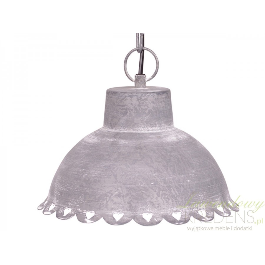 Rewelacyjna lampa w stylu prowansalskimz metalowym kloszem, która idealnie nadaje się do utworzenia przytulnego, punktowo oświetlonego wnętrza. Pięknie wyprofilowany klosz z lekko rozchyloną krawędzią, wzdłuż której wycięte zostały małe serduszka. Surowość powierzchni została przełamana białymi muśnięciami farby!