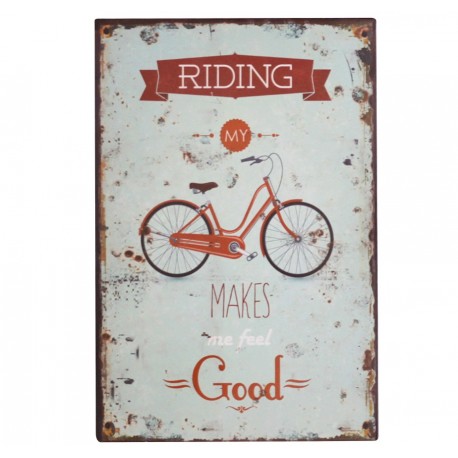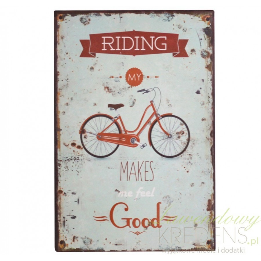 Prostokątne metalowe obrazki z klasycznym, damskim rowerem w kolorze czarwonym z wysoką kierownicą wśród angielskich napisów mówiących o tym, że jazda na roweże powoduje dobry nastrój. Nadrukowane obrazki retro z tłem specjalnie postarzanym za pomocą zadrapań i przebarwień. Polecamy także jako prezent!
