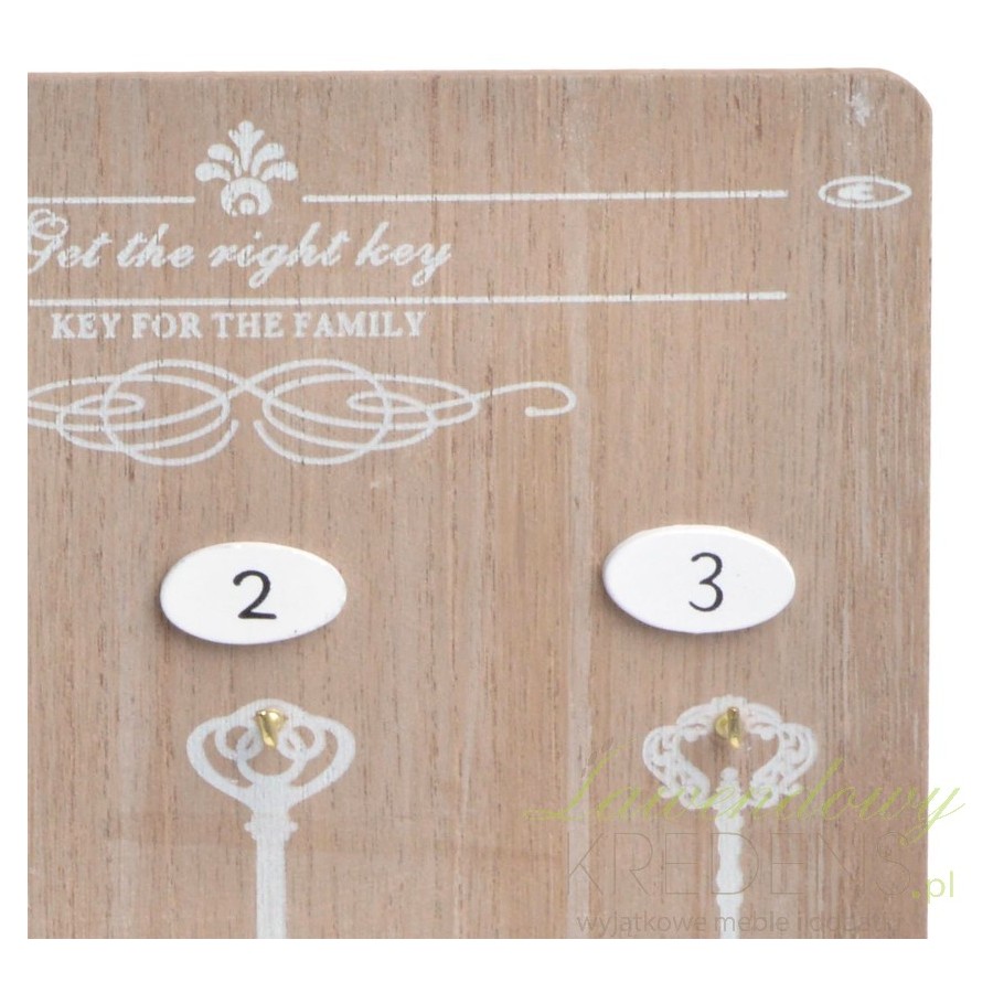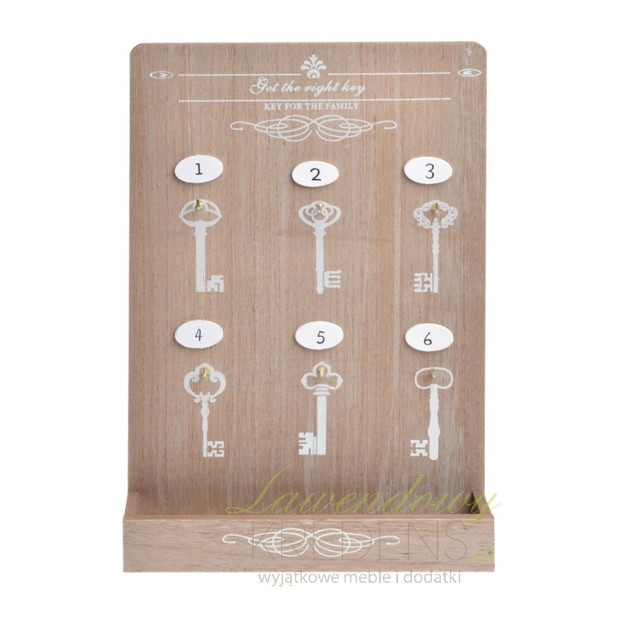 Praktyczna tablica na klucze z sześcioma ponumerowanymi wieszakami, które dodatkowo pozaznaczane są cudownymi ikonami dekoracyjnych kluczy w starym stylu. Dzięki temu każdy członek rodziny będzie miał wyznaczone indywidualny uchwyt na klucze!