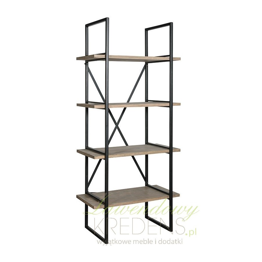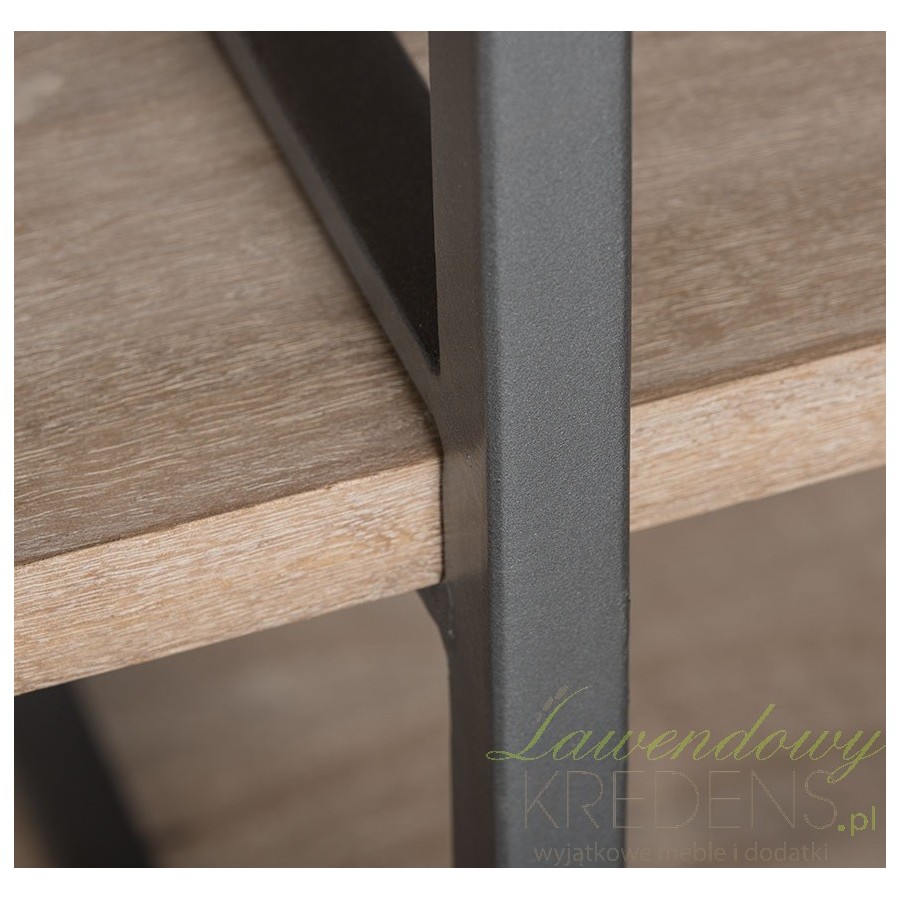 Klimatyczny i funkcjonalny dzięki dużym powierzchniom półek regał skandynawski z żelazną konstrukcją podstawy.
