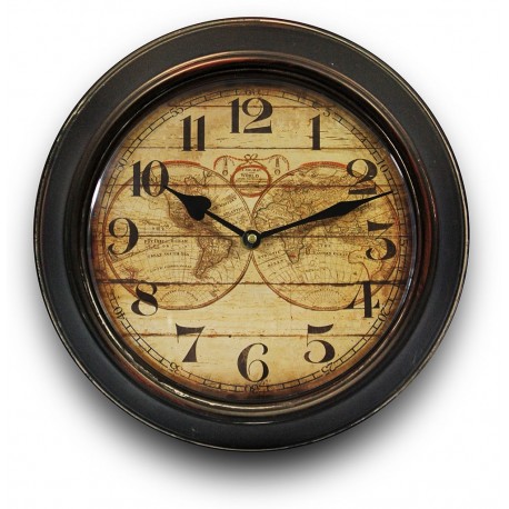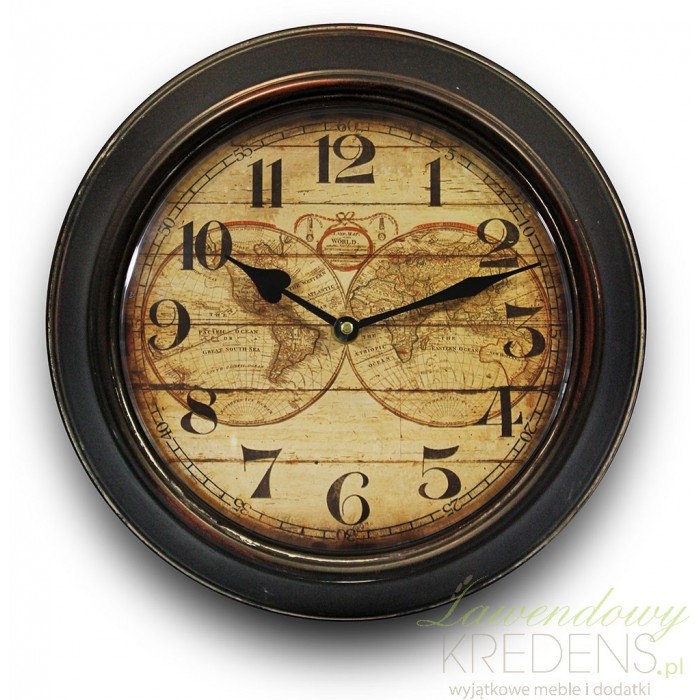 Zegar Vintage wykonany jest z wysokiej jakości metalu i szkła. Ma okrągły kształt i dość szeroką ciemną ramę. Tarcza zegara stanowi mapę świata z czarnymi dużymi arabskimi cyframi. Zegary ścienne i zegary Vintage to niesamowita ozdoba mieszkania.