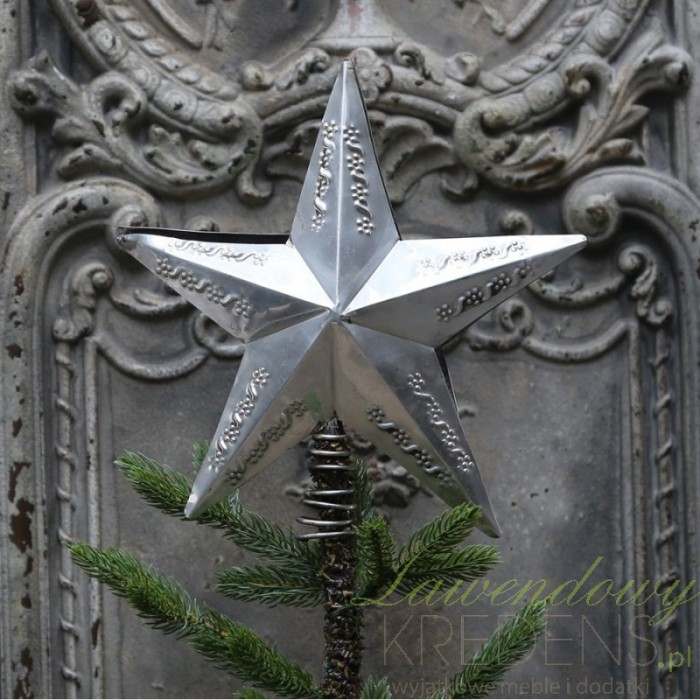 Połyskujący w świetle, ozdobiony delikatnymi, wypukłymi wzorkami przy krawędziach, szpic na choinkę od marki Chic Antique. Duża gwiazda, którą umieszcza się na szczycie choinki posiada specjalną, spiralnie zakończoną końcówkę, która stabilnie utrzymuje szpic na miejscu.