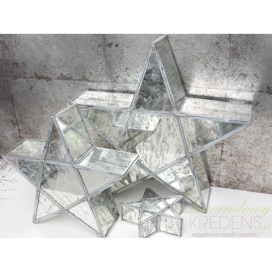 Fantastyczna dekoracja świąteczna w lustrzanym wydaniu! Trzy pięcioramienne gwiazdy to niezwykly komplet od Chic Antique, który nastrojowo może ozdobić Twoje wnętrze. Wszystkie powierzchnie gwiazd wykonane zostały ze składających się w jedną całość lusterek, które pięknie odbijają światło i całe wnętrze!