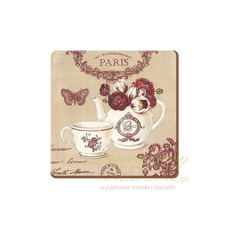 Nastrojowe kolorystycznie i graficznie podkładki w stylu francuskim, które rozwiążą problem śladów na blacie stołu po wilgotnych kubkach czy szklankach. Wypełniony różami dzbaneczek do kompletu z filiżanką na tle stylowych dekoracji przekonają do siebie każdego!