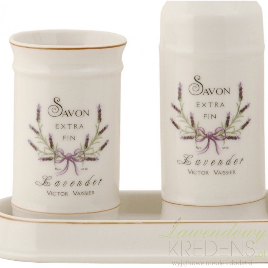 Czteroczęściowy zestaw łazienkowy w kolorze delikatnego beżu z francuskimi napisami w otoczeniu wieńca wykonanego z lawendowych gałązek. Gustowne dodatki do łazienki, w tym dozownik do mydła w płynie, kubek, pojemnik na cztery szczoteczki do zębów, a wszystko to ustawione na dopasowanej podstawce. Rewelacyjnie prowansalskie dodatki z lawendą!