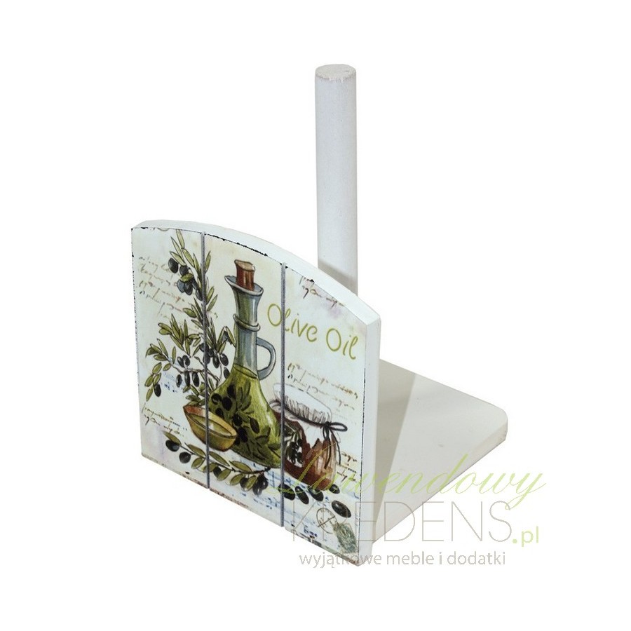Drewniany stojak na papier kuchenny z dodatkowym ozdobnikiem w postaci deseczki z motywem oliwek.