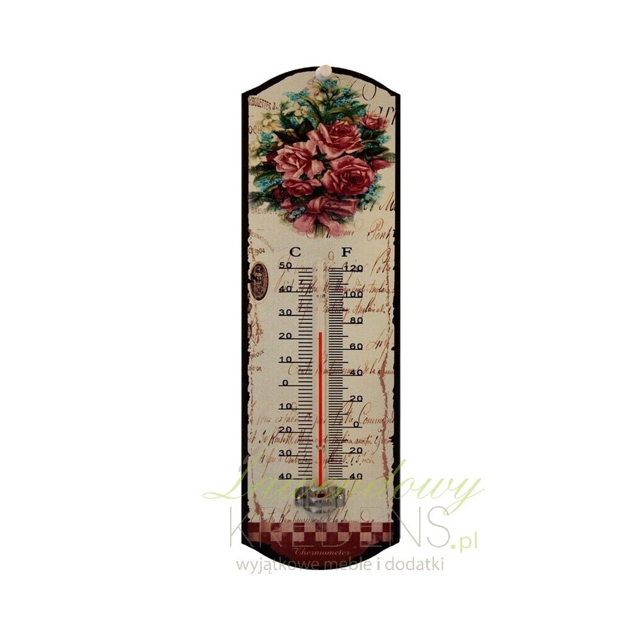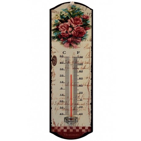 Termometr prowansalski na prostokątnej metalowej tabliczce, przyozdobionej kwiecistymi motywami graficznymi na tle delikatnych napisów. Całość tworzy przyjemny dla oka i co najważniejsze, praktyczny przedmiot niezbędny w każdym wnętrzu.