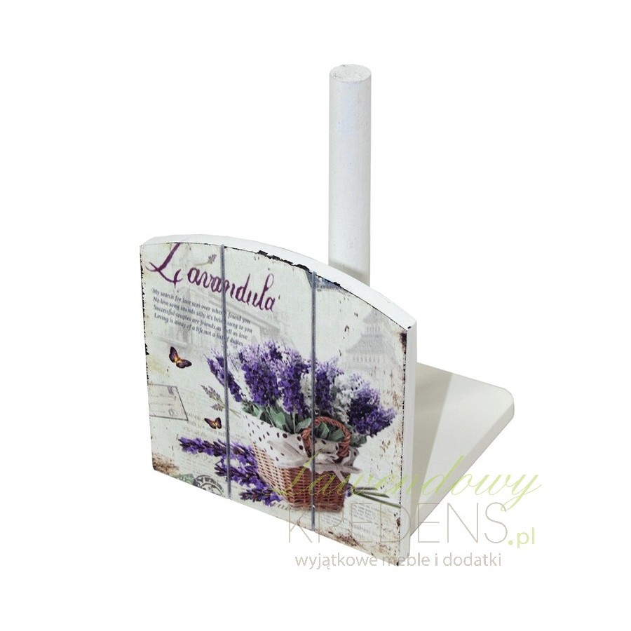 Drewniany stojak na papier kuchenny z ozdobną tabliczką, na któej widnieje wielki kosz wypełniony po brzegi kwiatami lawendy, od któej aż bije prowansalski klimat. Niepozorny stojak na papier z widocznymi, celowymi postarzeniami powierzchni zaakcentuje Twoje wnętrze świetną kolorystyką, przyjemną grafiką i funkcjonalością!