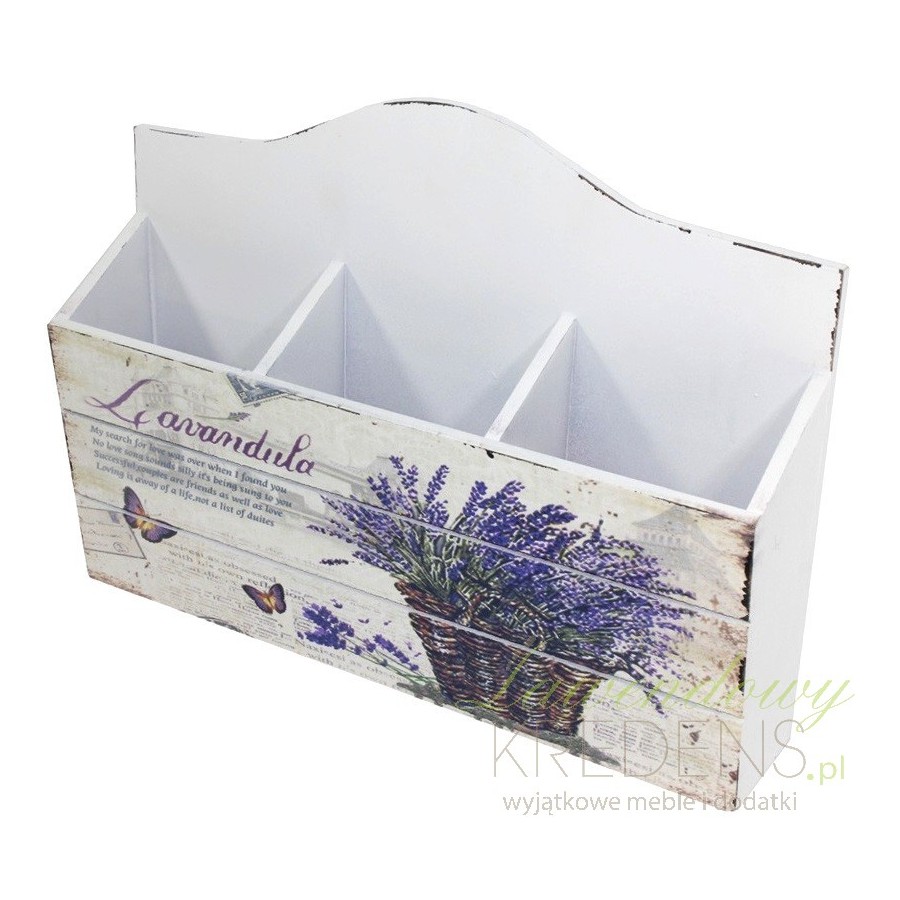 Urocze szafki w stylu prowansalskim z trzema przegródkami, w które idealnie wkomponują sie butelki oliwy bądź octu. Głównym motywem dekoracyjnym tej stojącej lub wiszącej szafki jest bukiet kwitnącej lawendy w dużym wiklinowym koszu, w otoczeniu angielskich napisów. Całośc wieńczą stylowe postarzenia powierzchni!