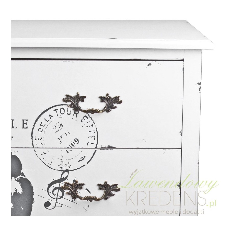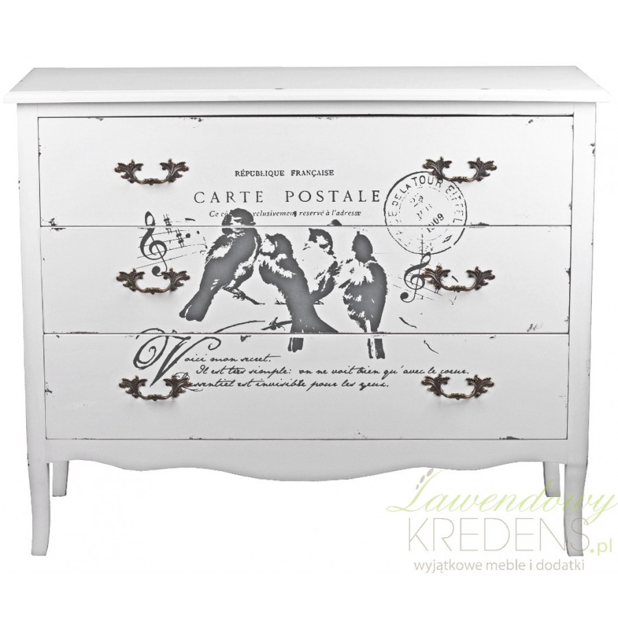 Niesamowicie stylowa i niepowtarzalna dzięki unikalnej grafice na froncie, komoda z napisami, której integralną częścią są trzy pojemne szuflady! Powierzchnia komody pomalowana została na kolor biały, napisy w języku francuskim i grafiki natomiast mają kolor czarny, co tworzy piękną, klasyczną kompozycję. Cztery ptaszki w otoczeniu pięciolinii z nutkami i świetnie wkomponowanych uchwytów otwierających szuflady to strzał w dziesiątkę!