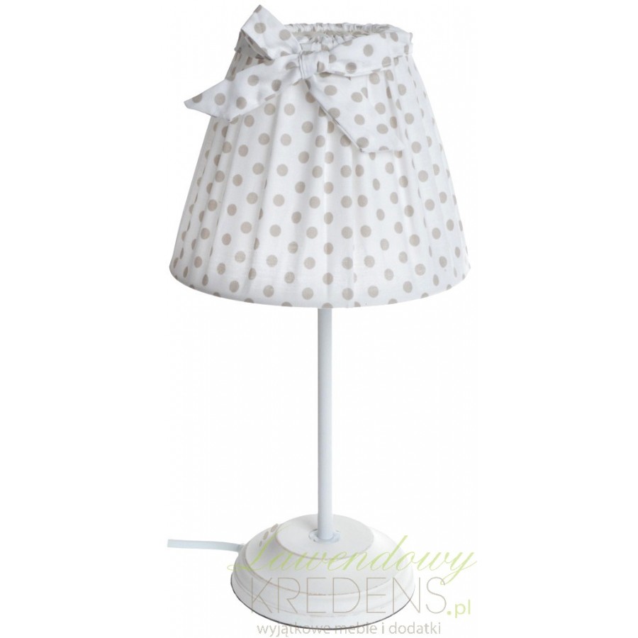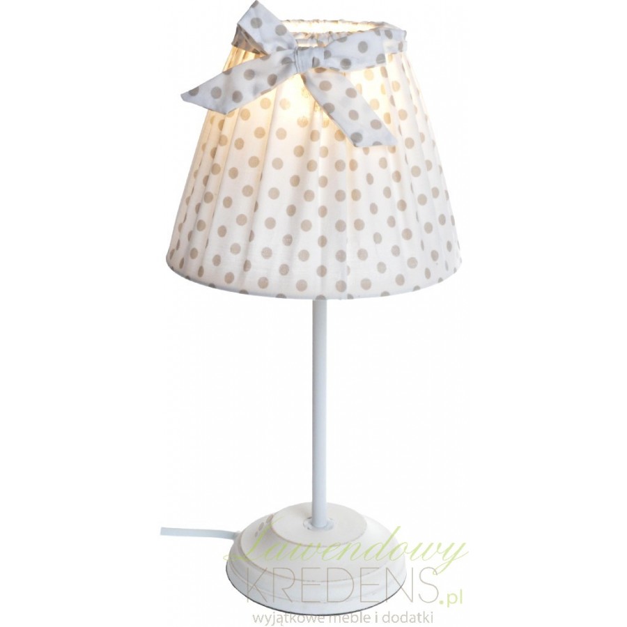 Bajkowa lampka prowansalska z rewelacyjnie prezentującym się materiałowym abażurem drapowanym przy krawędziach, w beżowo-brązowe grochy. Nad całością góruje śliczna kokarda, która nadaje lampce delikatności i subtelnej elegancji. Świetna jako lampka nocna w pokoju nie tylko małej dziewczynki czy nastolatki!