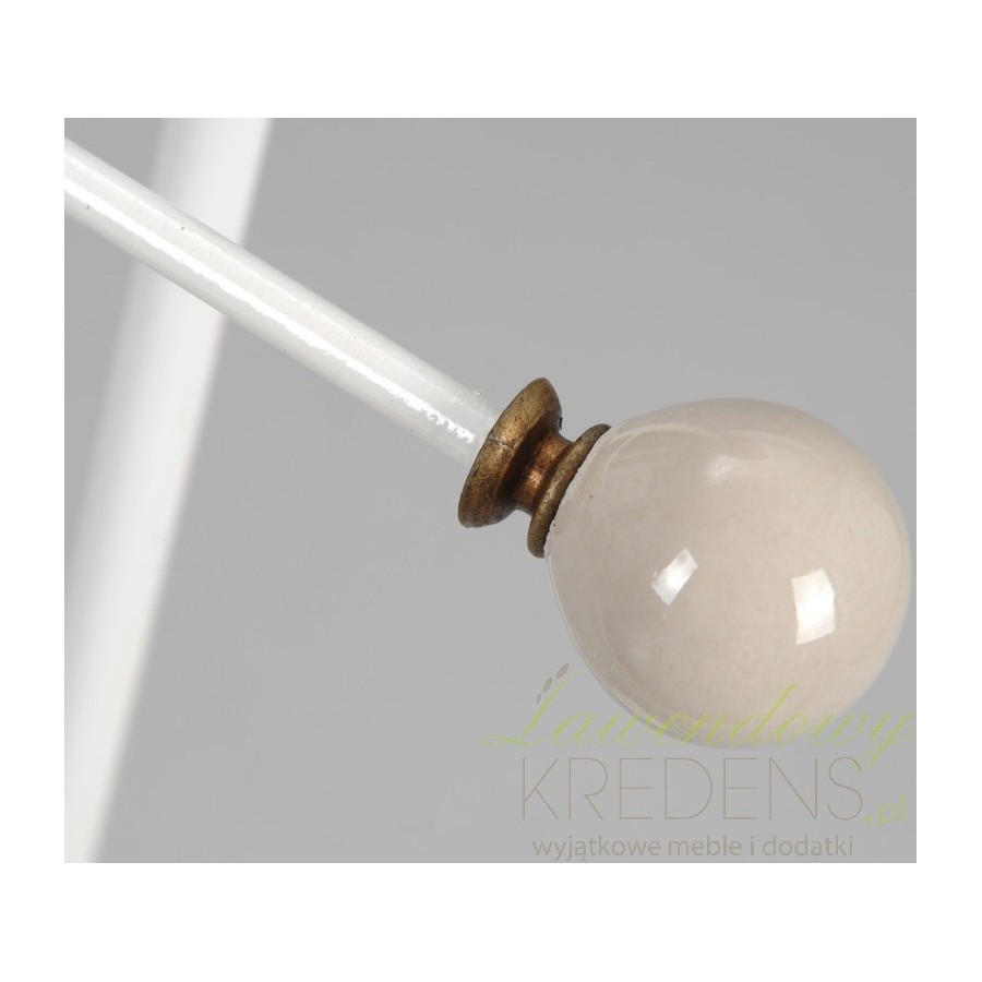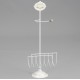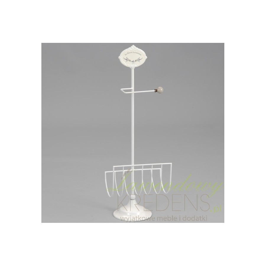 Biały stojak na papier toaletowy łącyz w sobie uchwyt na papier oraz półkę na gazety lub książki. Całość dodatkowo okraszona została motywem lawendy z delikatną grafiką i francuskim napisem. Uchwyt na papier jest dodatkowo zabezpieczony ceramiczna kulką, która zapobiegać ma ześlizgiwaniu się rolki z poręczy!