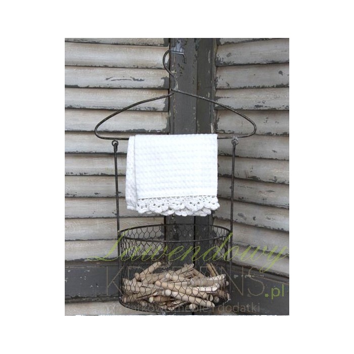 Pomysłowy, metalowy kosz wiszący marki Chic Antique, zamocowany do specjalnego, stabilnego wieszaka.