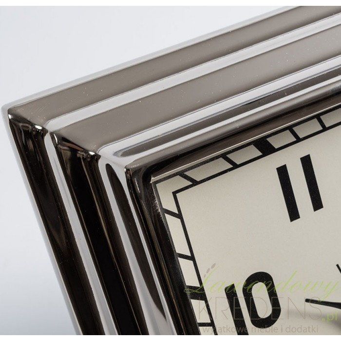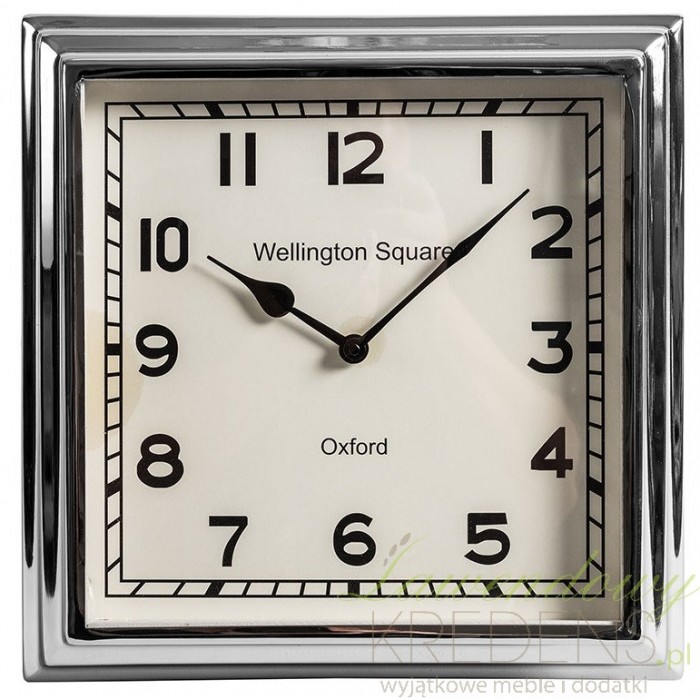 Zamknięty w srebrnej, kwadratowej obudowie z wypolerowanej stali nierdzewnej zegar Belldeco z dużymi cyframi!