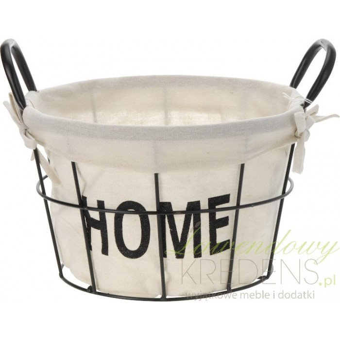 Dodatki do łazienki to niezbędne przybory, które ułatwią nam życie. Metalowy kosz ma okrągły kształt i duże, wygodne uszy do trzymania. Wyłożony jest od wewnątrz bawełnianą jasną tkaniną z czarnym dużym napisem HOME. Może posłużyć na kosmetyki lub brudne rzeczy do prania.