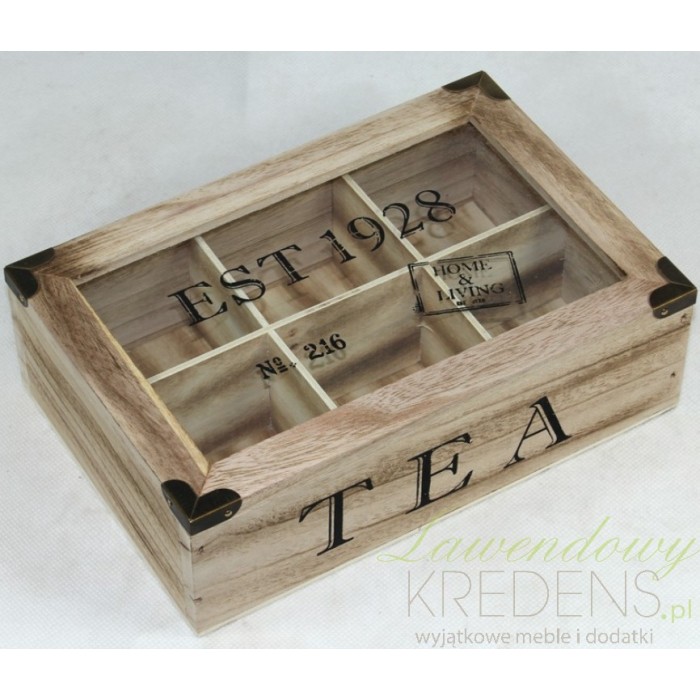 Klasyczny, zamykany pojemnik na herbatę ze szklanym wiekiem, dzięki któremu możemy bez problemu przeglądać zawartośc bez otwierania. Sześć całkowicie oddzielonych od siebie przegródek ułatwia sortowanie herbat. Pudełko ozdobione zostało napisami TEA na frontowej ściance i datą z emblematem na wieczku!