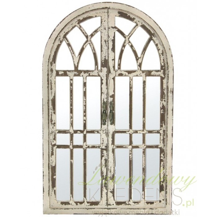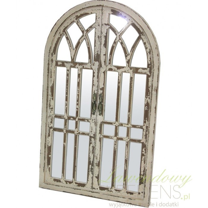 Niewyobrażalnie pięknie prezentujące się w klimatycznych wnętrzach lustro okno, które w sposób niebanalny odmeini przestrzeń nadając jej stylowego charakteru. Drewniana, kremowa rama nosząca ślady licznych postarzeń w niesamowity sposób okala powierzchnię lustra, tworząc w pewnym sensie niesamowity obraz!