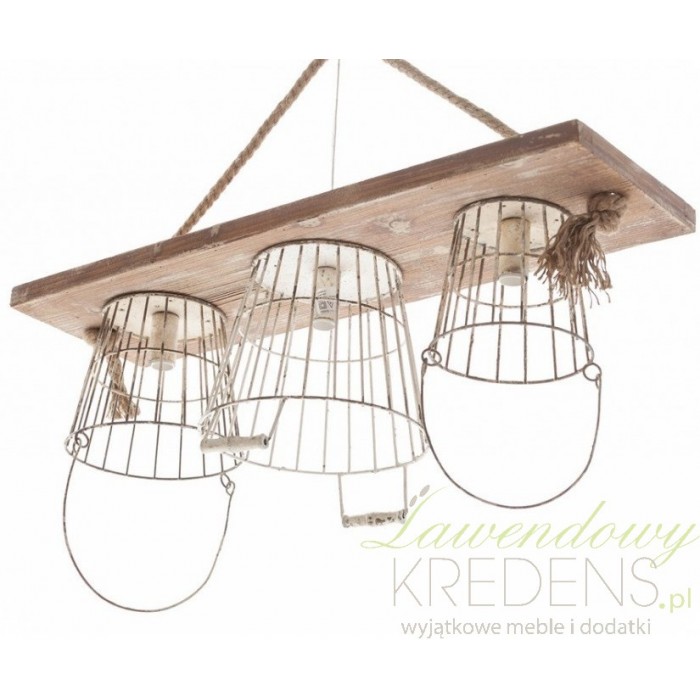 Wisząca lampa w stylu rustykalnym od firmy Aluro, wyjątkowa i niezwykle nastrojowa. Drewniana podstawa wisi na grubym parcianym sznurku, a trzy źródła światła osłonięte zostały metalowymi konstrukcjami, które przypominają koszyki z uszami i uchwytami! Takiej lampy nie znajdziecie u żadnych znajomych!