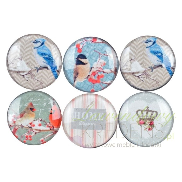 Sześć magnesów na lodówkę to dodatki do kuchni, które w uroczy sposób ożywią Twoje mieszkanie. Pozwól, by piękne obrazki dodały uroku Twojej kuchni. 4 obrazki bowiem przestawiają ptaki siedzące na gałęziach drzew, otulonych białym, snieżnym puchem. Pozostale ozdobiono wiezrunkiem korony i napisem. Spraw by styl prownsalski zagościł w Twoim domu!