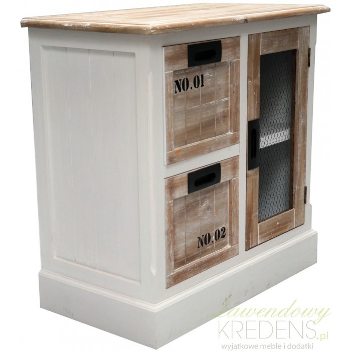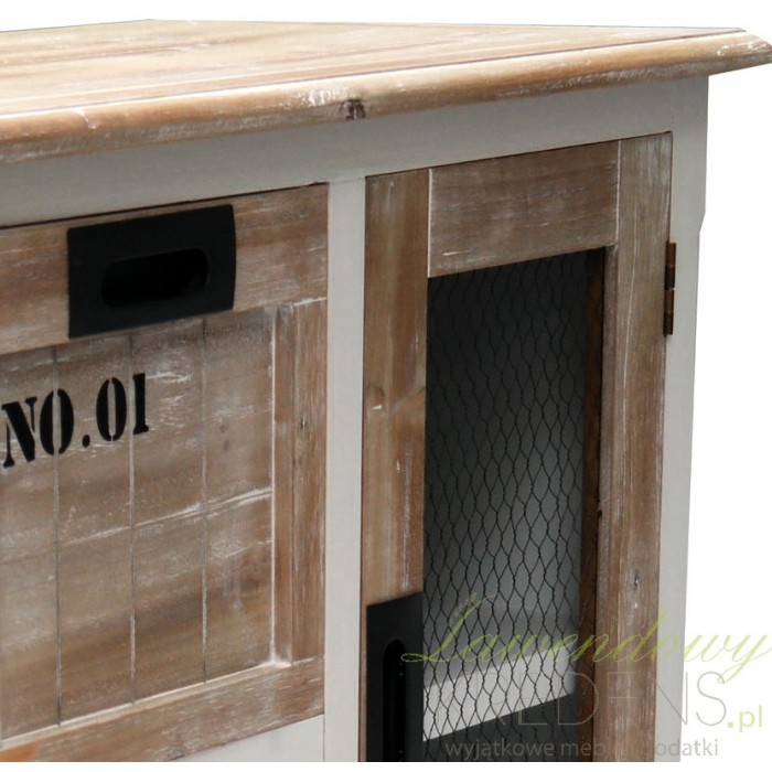 Porządnie wykonana komoda prowansalska została zbudowana z drewna paulownia. Mebel wyposażono w dwie wysuwane szuflady opatrzone napisami o czarnej barwie oraz dwie półki zamknięte za drzwiczkami wypełnionymi przepuszczającym światło materiałem. Komodę utrzymano w kolorze matowej bieli a jej elementy poddano zabiegom bielenia. Meble w stylu prowansalskim - polecamy!